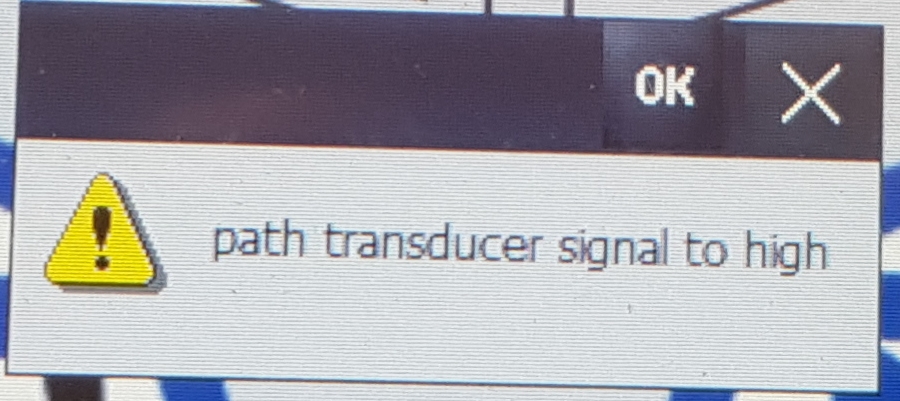 Diese Fehlermeldung wird erzeugt, wenn die Maschine zu weit nach oben gefahren wird. Der Wegaufnehmer muss ~5mm betätigt werden, sonst ist das Signal zu groß und die Fehlermeldung wird erzeugt.