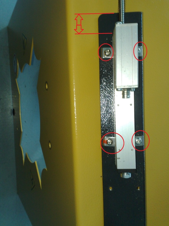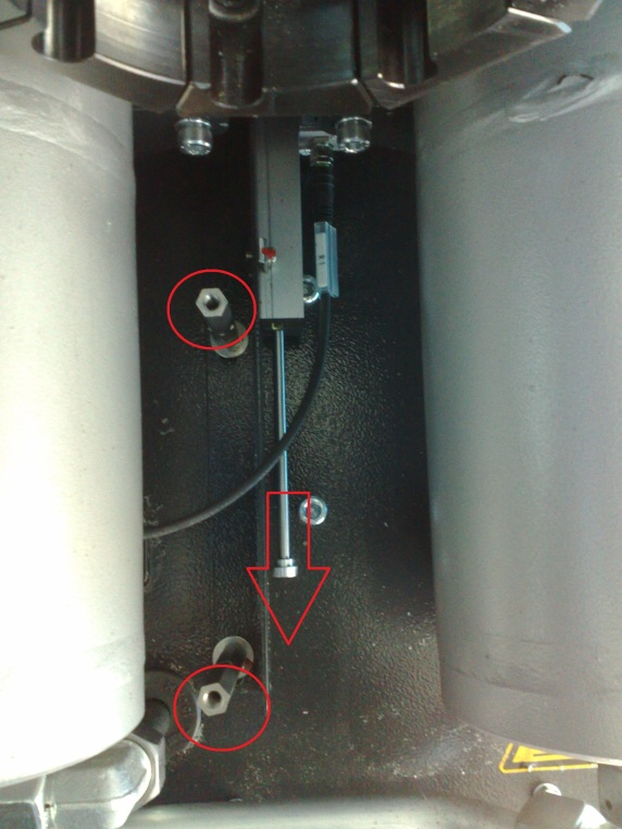 | Pull the rod of the sensor back (like the arrow) to move the sensor with the mounting plate back into the machine. Tight the two spacer bolts. |