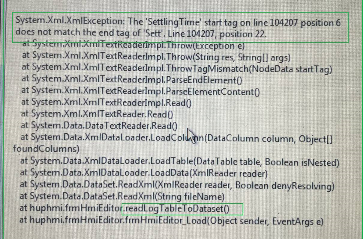 Reading the log table into a dataset(database) fails because in line 104207 position 6 there is a tag "<SettlingTime>" and in line 104207 and this tag must be ended in line 104207 in position 22 with "<\SettlingTime>".